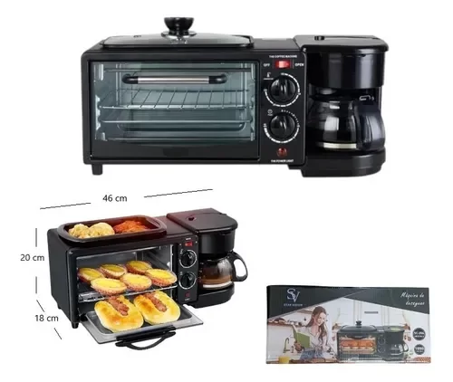Prepara un desayuno completo con un solo electrodoméstico! Gracias al Horno Cafetera 3 en 1, disfrutarás de un desayuno espectacular en minutos, eliminando la necesidad de preparar cada alimento por separado. Este versátil aparato combina funciones de tostadora multifuncional, cafetera y sartén para freír individual.